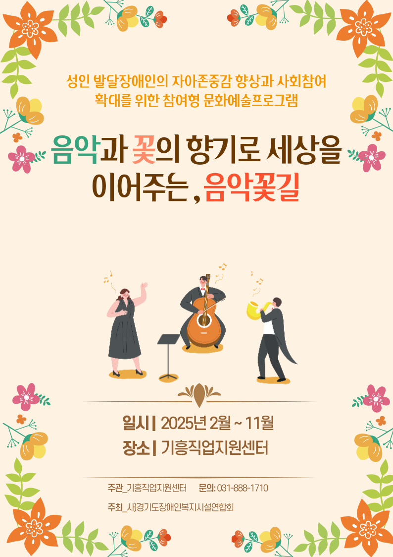기흥직업지원센터에서는 성인발달장애인의 자아존중감과 사회성 향상을 위해 경기재활프로그램 음악꽃길을 진행하려고 합니다.